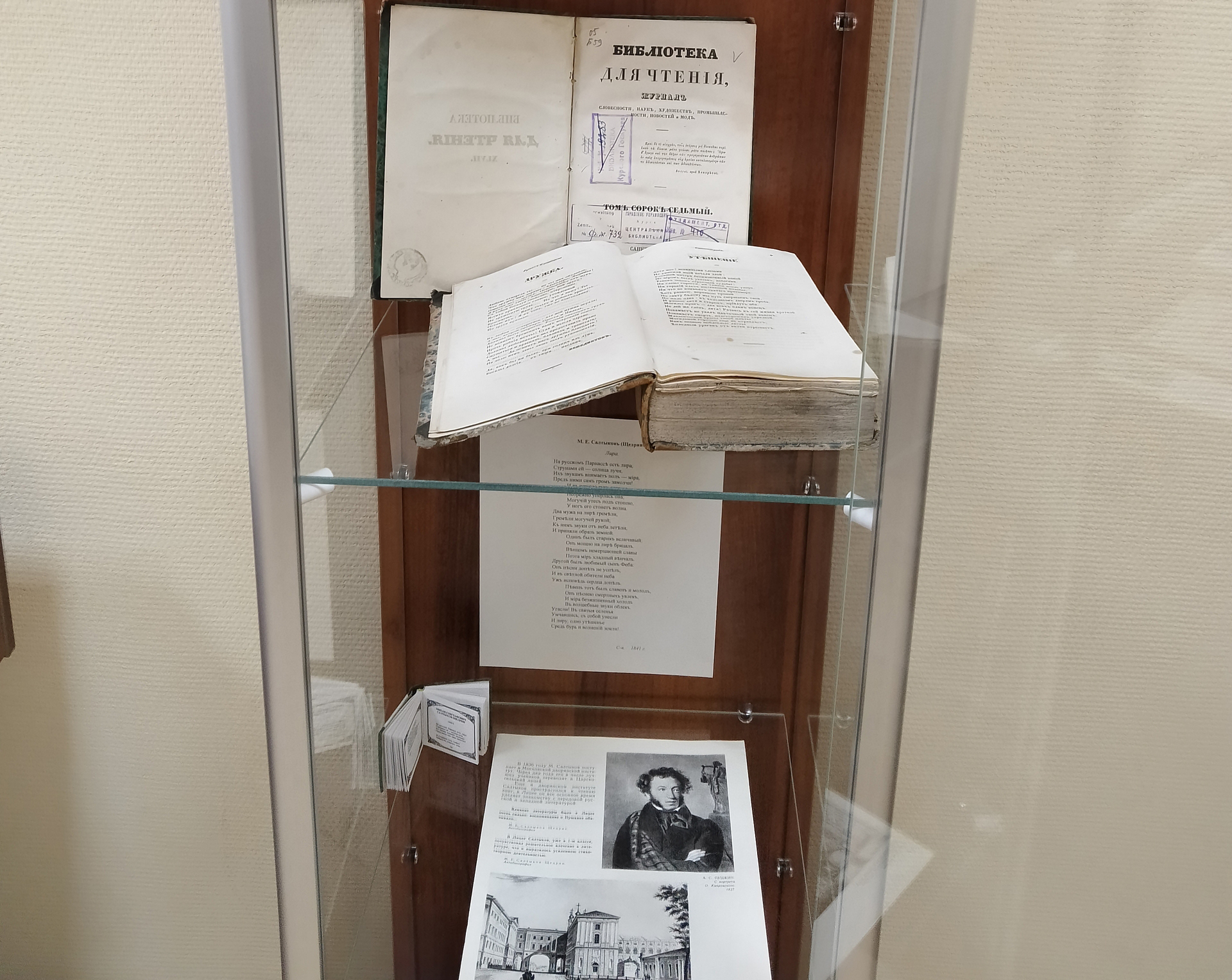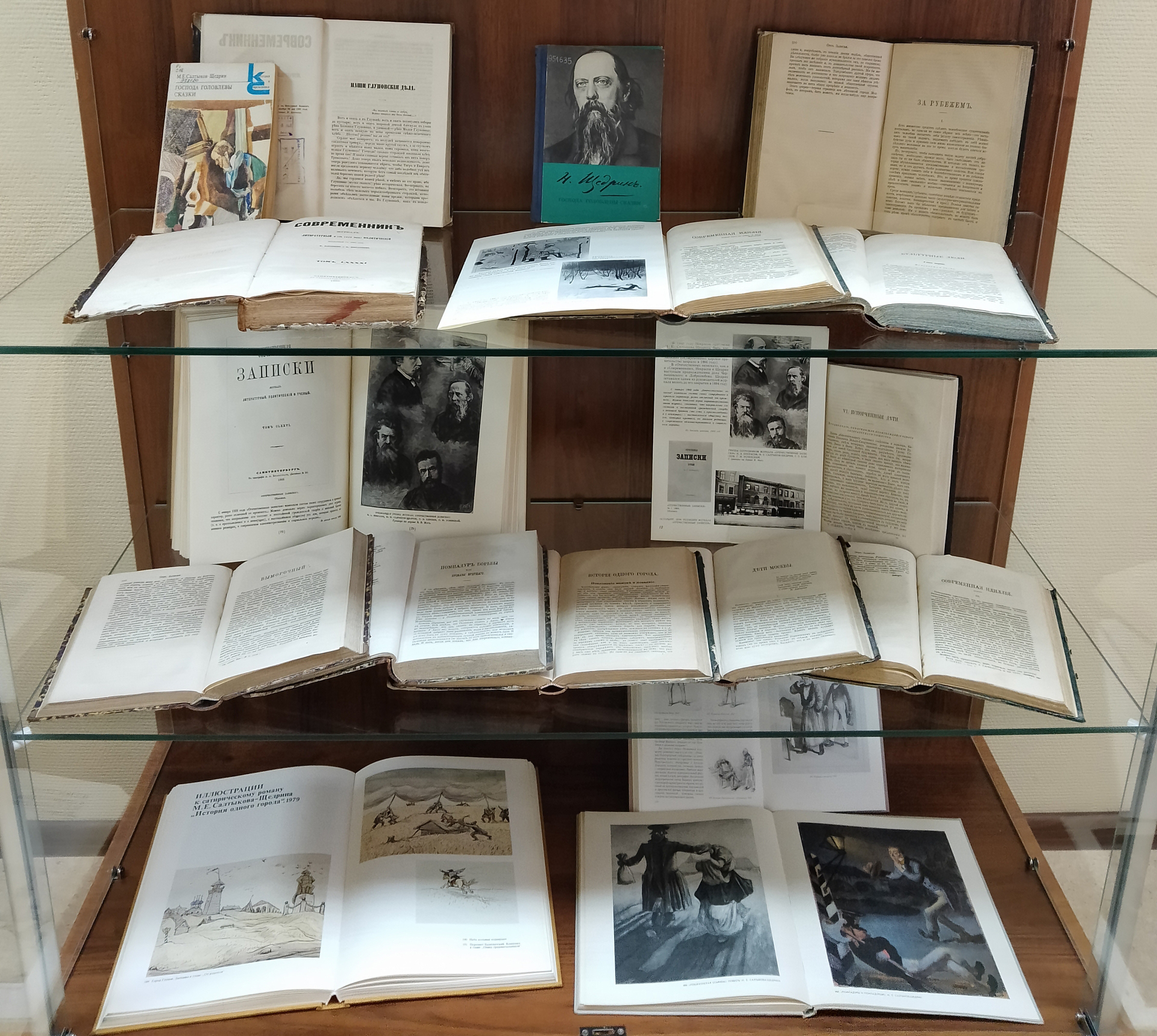 Из богатейшего массива отечественных журналов 40 – 80-х годов XIX века с публикациями произведений М.Е. Салтыков-Щедрина представлены журналы «Современник», «Отечественные записки», «Русский вестник», «Вестник Европы» за 1869, 1872, 1876, 1881, 1883 годы, в которых опубликованы «Пошехонские рассказы», «Письмо к тетеньке», «Наши глуповские дела», «Дикий помещик», «Испорченные дети», «Благонамеренные речи», «Господа ташкентцы», сказки и другие произведения писателя — сатирика.