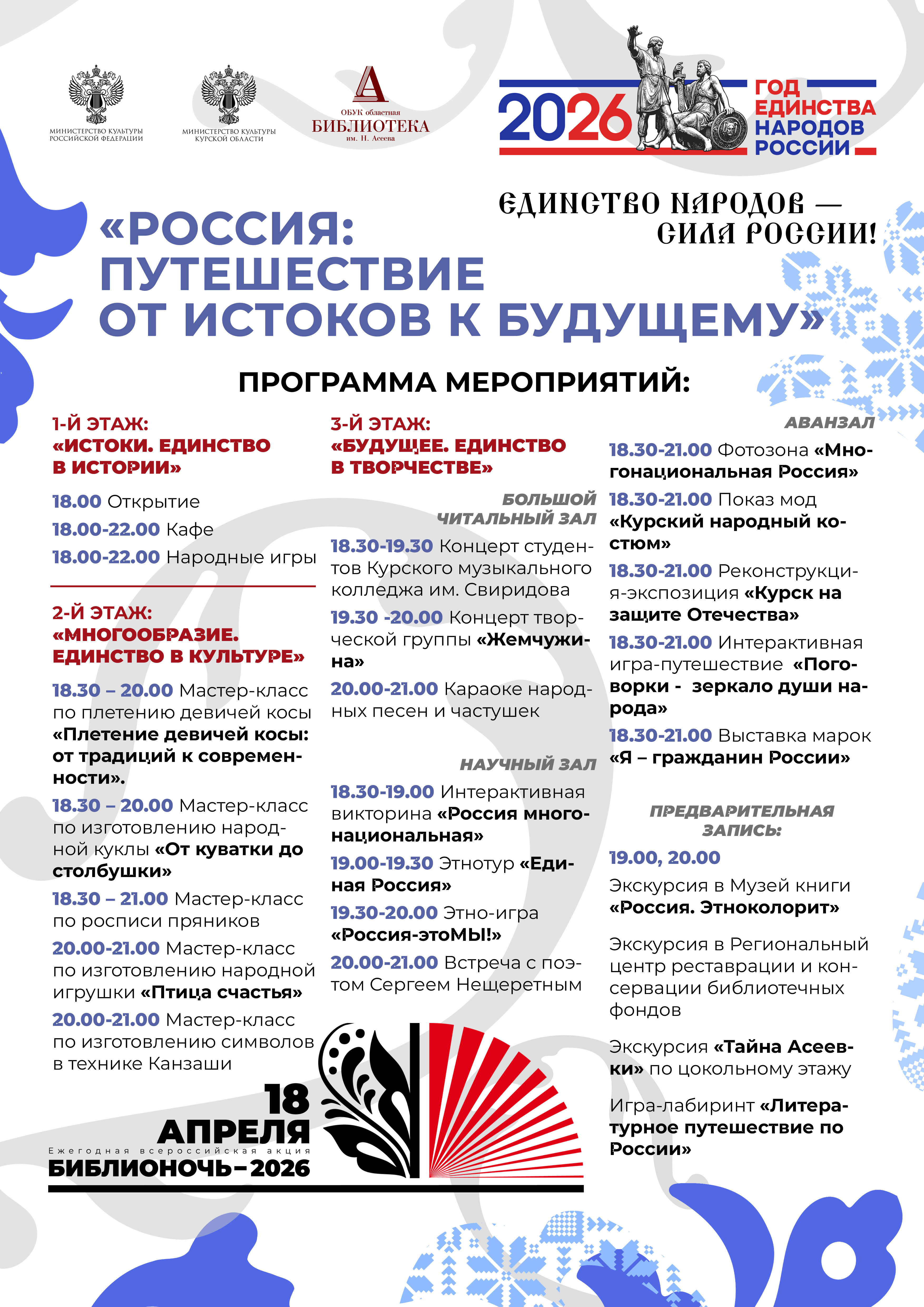 В рамках всероссийской акции «Библионочь-2026» центральная библиотека региона приглашает гостей на культурное путешествие, символизирующее единство народов России: от истоков через многообразие культур к будущему.